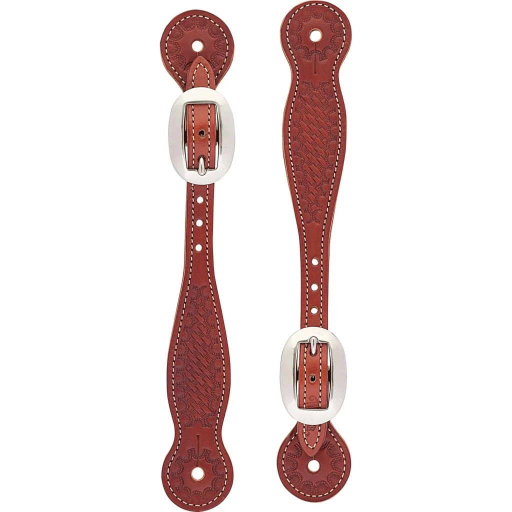 - Spur straps have a stamped, cowboy basketweave pattern that promotes a trendy look
