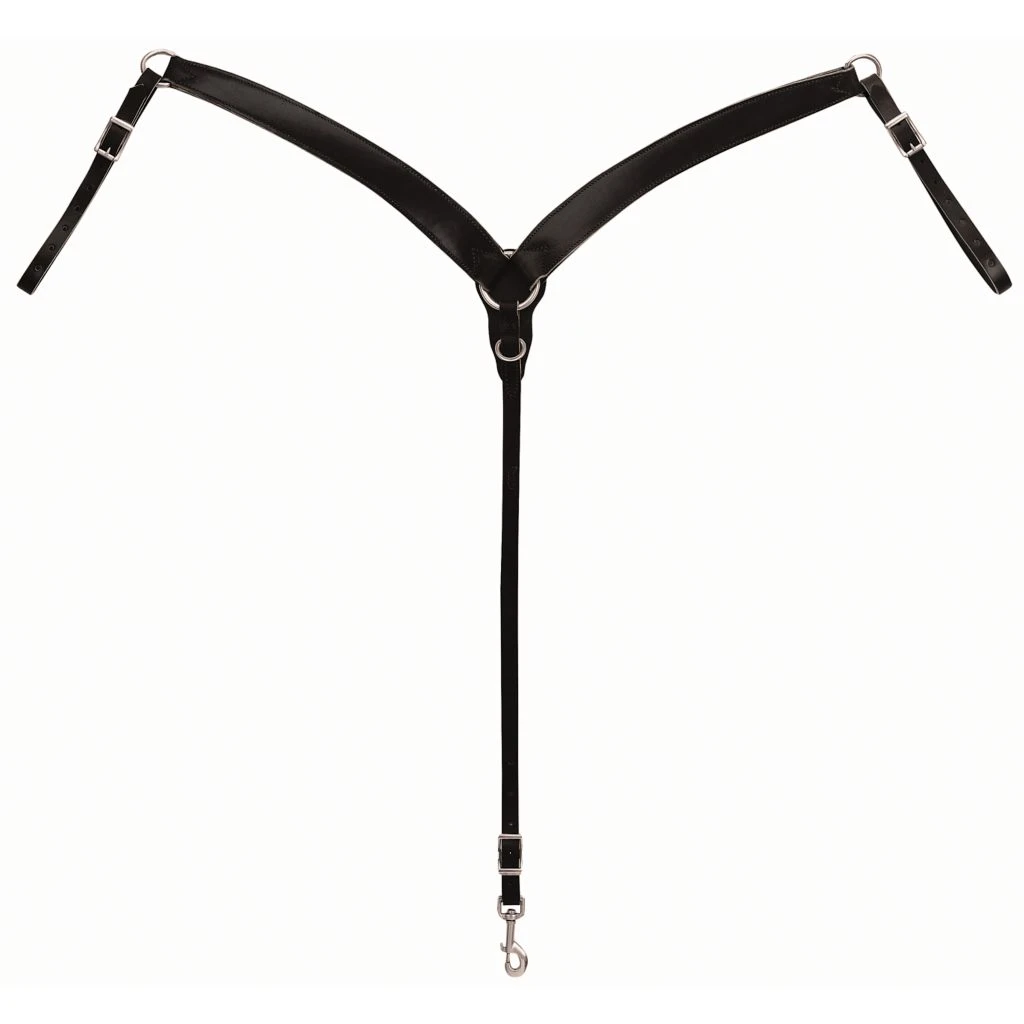 - The horse breast collar has a center ring with a leather backer, an adjustable center strap, and a tie down dee