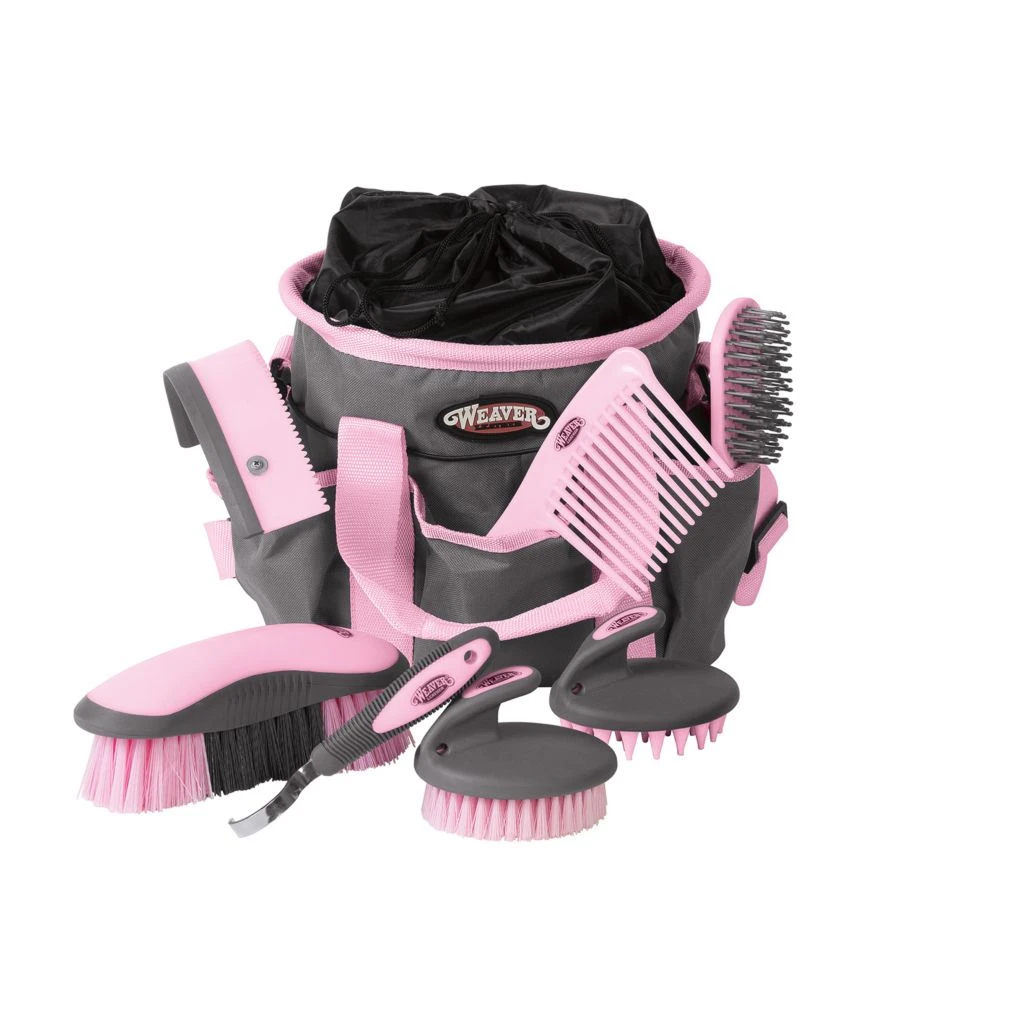 - 7-piece assortment of grooming essentials in a durable nylon horse grooming tote bag