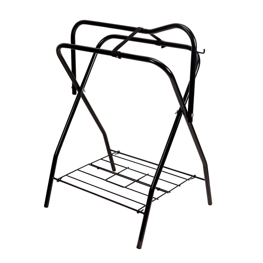- Horse saddle stand features a bridle hook and a handy bottom grate to help keep stirrups off the ground