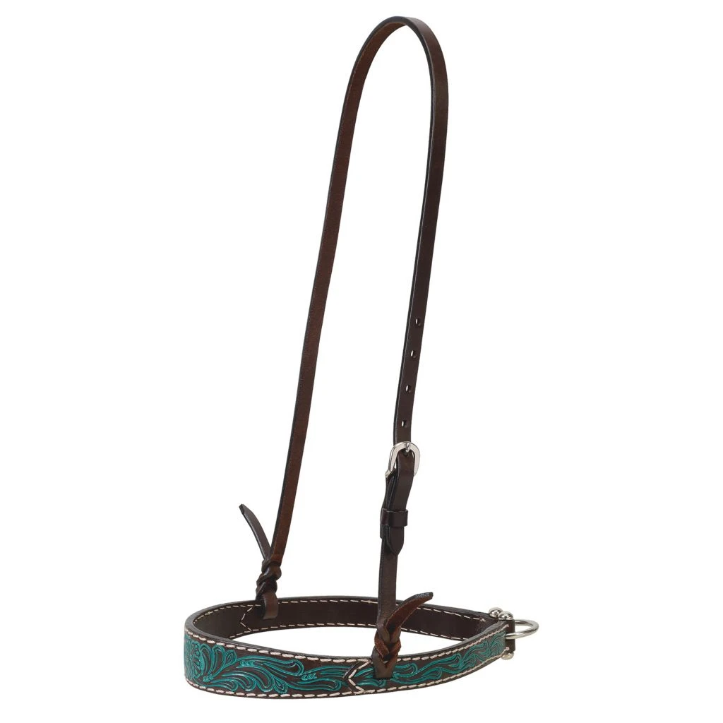 - Floral design highlighted by a turquoise stain gives this western noseband a flashy look