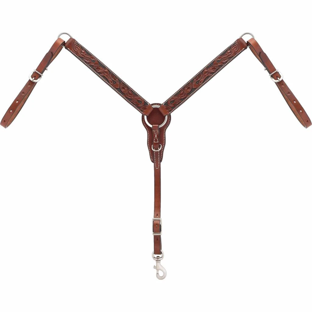 Crafted from chestnut leather and carved with an intricate floral design highlighted with black stain. Features non-rust stainless steel hardware. Pony Size